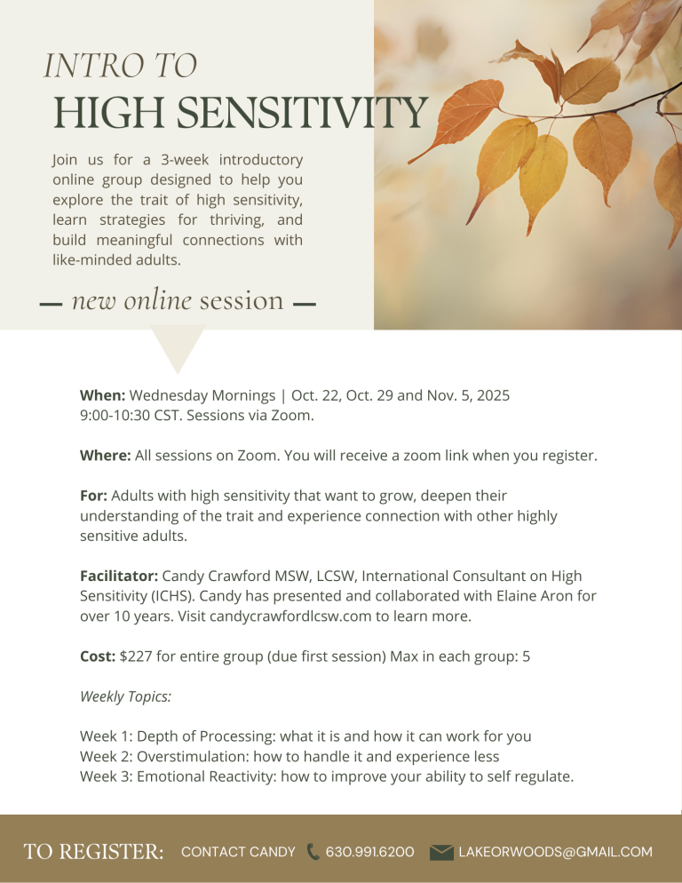 Join this unique community to understand yourself and your trait in new, deeper ways. Workshops/Events are both in-person or via Zoom with convenient morning or evening options. Email lakeorwoods@gmail.com to sign up or learn more.